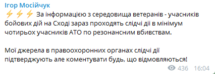 Как сообщает в своем Telegram-канале экс-нардеп от Радикальной партии Игорь Мосийчук, одновременно следственные действия проходят как минимум у четырех участников АТО по резонансным убийствам.