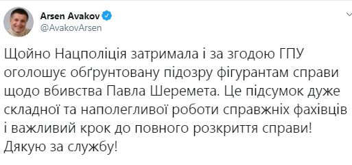 Глава МВД Арсен Аваков написал, что Нацполиция задержала и с согласия ГПУ объявляет обоснованные подозрения фигурантам дела об убийстве Павла Шеремета.