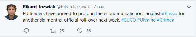 "Лидеры ЕС согласились продлить экономические санкции против России еще на шесть месяцев. Официальное оформление будет на следующей неделе", - сообщил в журналист "Свободной Европы" Рикард Йозвяк в своем Twitter.