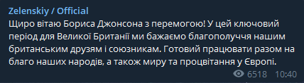 "Искренне поздравляю Бориса Джонсона с победой! В этот ключевой период для Великобритании мы желаем благополучия нашим британским друзьям и союзникам. Готов работать вместе на благо наших народов, а также мира и процветания в Европе", - написал Зеленский.