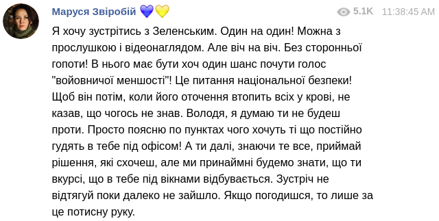 Маруся Зверобой хочет встретиться с Зеленским один на один до того как "всех утопят в крови"