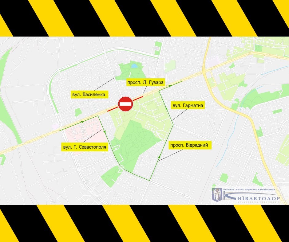 В Киеве, 15 декабря, на проспекте Любомира Гузара перекроют движение из-за ремонта моста. Схема объезда