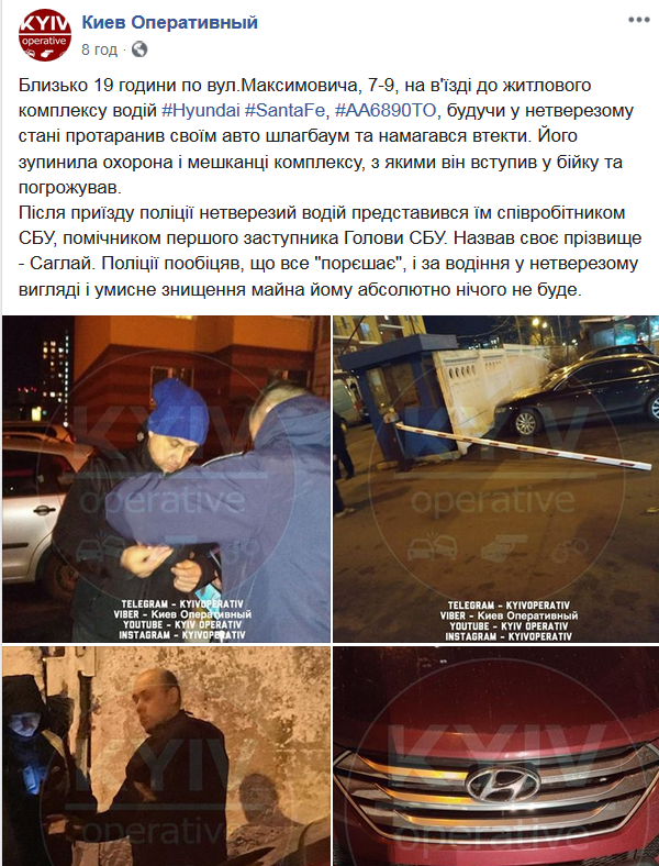 После приезда полиции нетрезвый водитель представился им сотрудником СБУ, помощником первого заместителя председателя СБУ. Назвал свою фамилию - Саглай. Полиции пообещал, что все "порешает", и за вождение в нетрезвом виде и умышленное уничтожение имущества ему абсолютно ничего не будет", - утверждают свидетели инцидента.