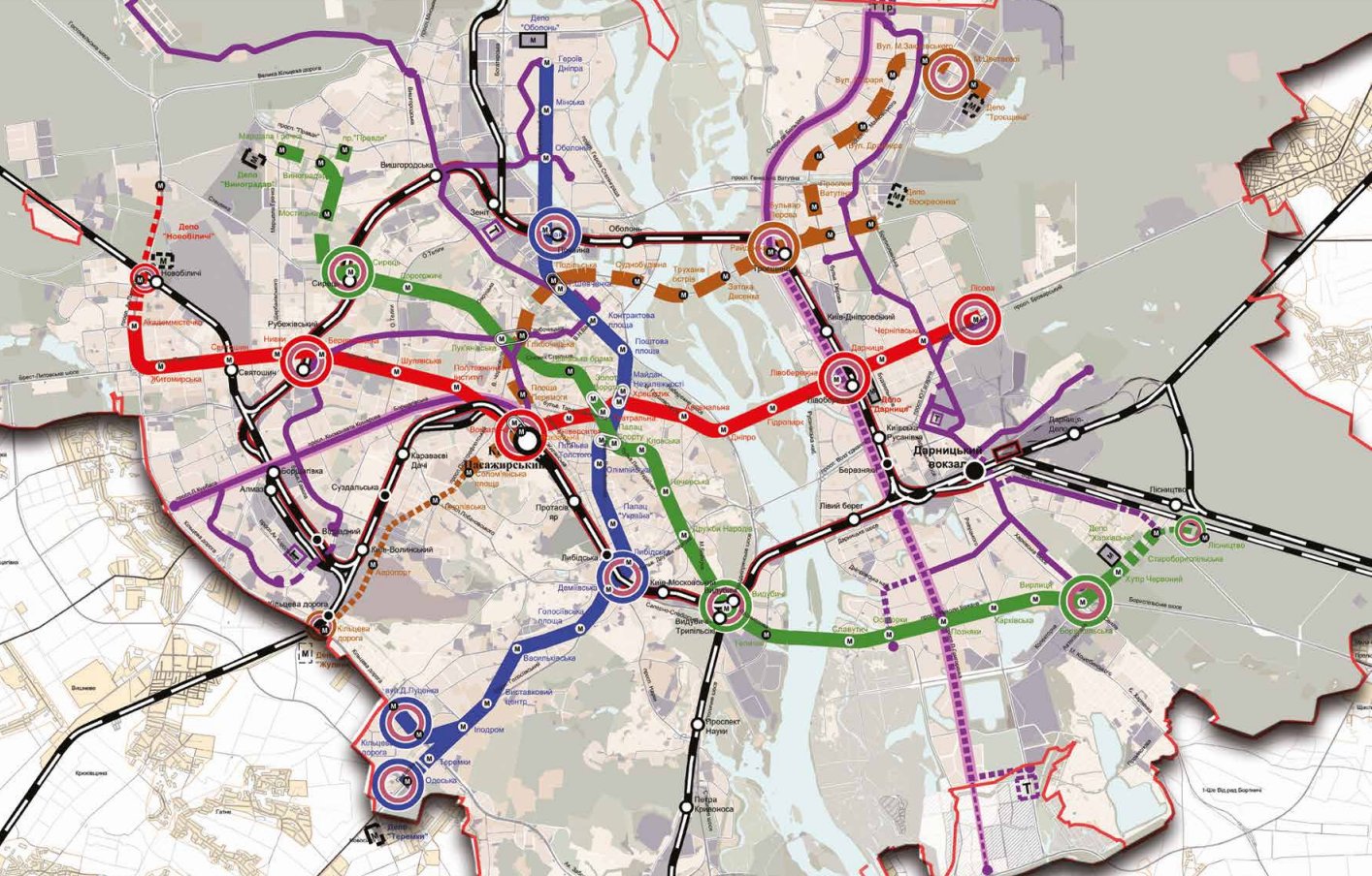 Строительство четвертой Подольско-Выгуровской линии метрополитена на Троещину и перспективной пятой. Общая протяженность линий метрополитена увеличится в 1,5 раза.