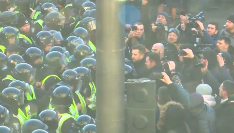 Глава Нацкорпуса Андрей Билецкий подошел к кордону силовиков. Разговаривают.