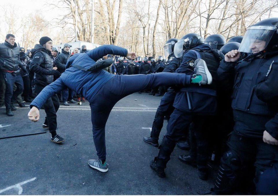 В Сети обсуждают фото националистов, дерущихся с полицией, и говорят, что они не похожи на аграриев.
