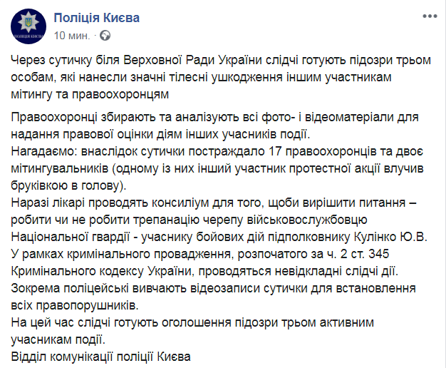 После столкновений у стен Верховной Рады в Киеве следователи готовят подозрения трем лицам, которые нанесли значительные телесные повреждения другим участникам митинга и правоохранителям.