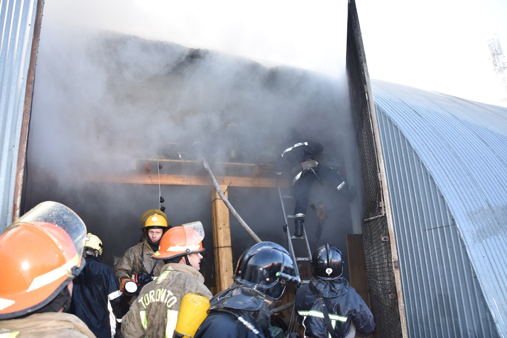 "18 декабря в 11 час. 12 мин. в службу спасения поступил вызов о пожаре на ул. Базовой, 16, где загорелись складские помещения. На место происшествия прибыли подразделения спасателей ГСЧС, которые приступили к ликвидации пожара", - отметили в ГСЧС. Сейчас спасатели готовятся раскрыть крышу складских помещений, которые затянуло клубами дыма.