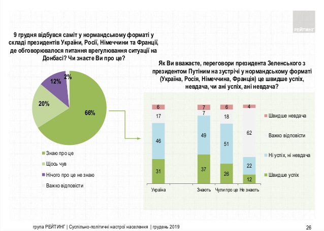 Хорошо информированными о саммита в "нормандском формате", который прошел в Париже 9  декабря, оказались 66% украинцев. Из них около 40% считают результаты проведения саммита скорее успехом президента Зеленского, половина – ни успехом, ни неудачей. Только 7% увидели лишь негативные результаты.