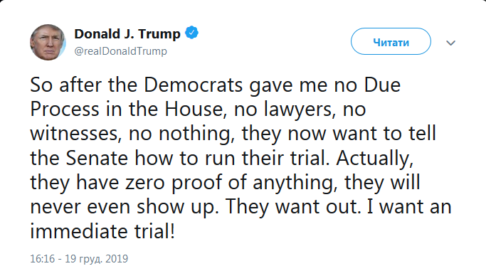 "Итак, после того, как демократы не дали мне должного судебного разбирательства в Палате представителей, ни адвокатов, ни свидетелей, ни чего-либо, они теперь хотят указать Сенату, как там проводить свой процесс. На самом деле у них ноль доказательств, они даже показываться не будут. Они хотят остаться в стороне. Я хочу немедленного начала процесса!", - написал Трамп.