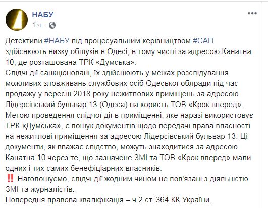 Обыски в помещении одесского телеканала Думская TV не связан с деятельностью журналистов. О причинах следственных действий в пятницу, 20 декабря, сообщает пресс-служба НАБУ в Facebook.