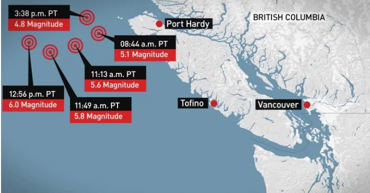 Канаду потрясло сразу пять землетрясений в один день. Карта толчков