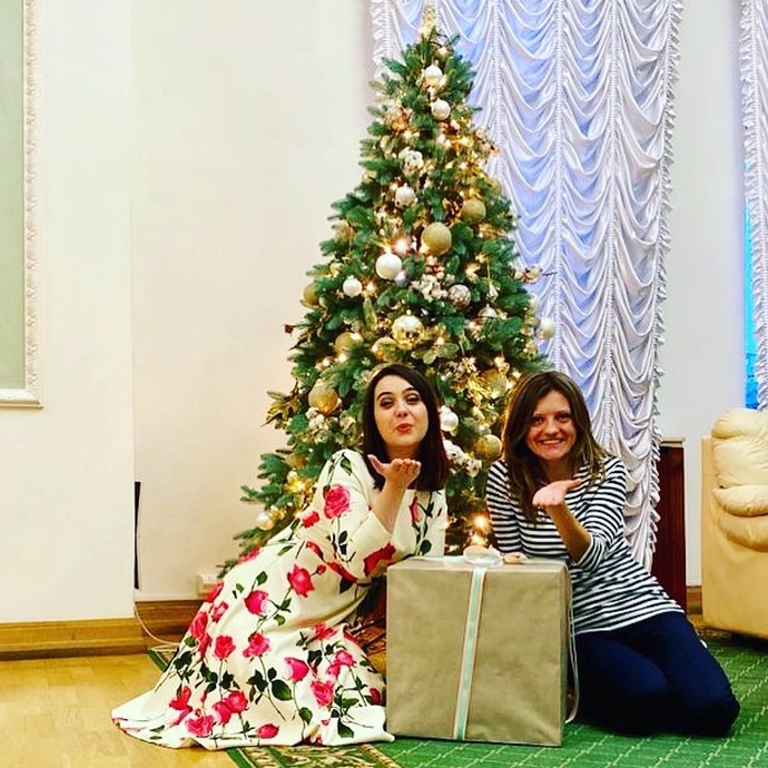 При этом, судя по фотографии, елок в Офисе президента две - большая и маленькая. На фото Мендель позирует с елкой в пестрой блузке.
