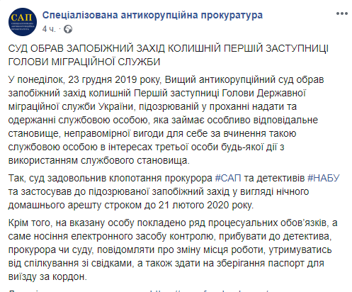 Под ночной домашний арест отправил Высший антикоррупционный суд бывшего первого зама главы Государственной миграционной службы Дину Пимахову. Об этом сообщает САП на своей странице в соцсети.