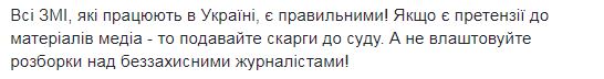 "Правоохранители должны жестко реагировать на каждый случай нападения и угроз журналистам. Власть должна продемонстрировать политическую волю - и осудить разделение журналистов на "правильных" и "неправильных"", - написал Томиленко.