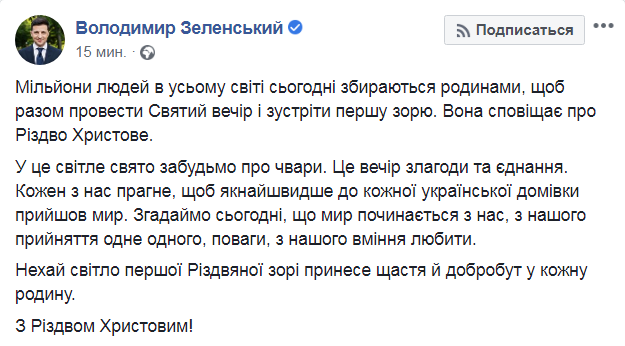 Миллионы людей во всем мире сегодня собираются семьями, чтобы вместе провести сочельник и встретить первую звезду. Она сообщает о Рождестве Христовом. В этот светлый праздник забудем о распрях. Это вечер согласия и единения. Каждый из нас хочет, чтобы как можно быстрее в каждый украинский дом пришел мир. Вспомним сегодня, что мир начинается с нас, с нашей принятия друг друга, уважения, с нашего умения любить", - призвал Зеленский.