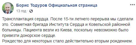 "Трансплантация сердца. После 15-ти летнего перерыва мы сделали это. Совместная бригада Института Сердца и Ковельской районной больницы. Пациента везли из Киева, поскольку невозможно было привезти донорское сердце", - написал он.