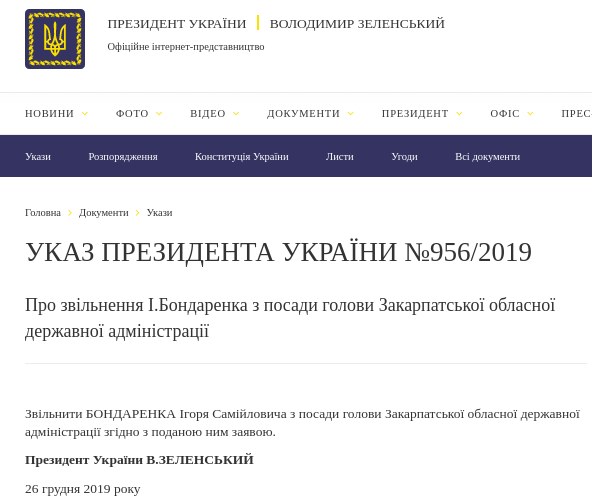 Соответствующие указы №956/2019 и №957/2019 появились на сайте главы государства.