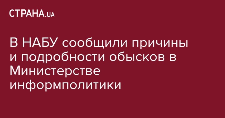 "Следственные действия санкционированы, осуществляются в рамках расследования возможной растраты должностными лицами Министерства информационной политики Украины по предварительному сговору со служащими ГП "Центр защиты информационного пространства Украины" и представителями частных компаний бюджетных средств, полученных на финансирование проектов по защите национального информационного пространства", - говорится в сообщении НАБУ.