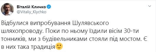 "Состоялись испытания Шулявского путепровода. Пока по нему ездили восемь 30-ти тонников, мы со строителями стояли под мостом. Есть у них такая традиция", – написал мэр.
