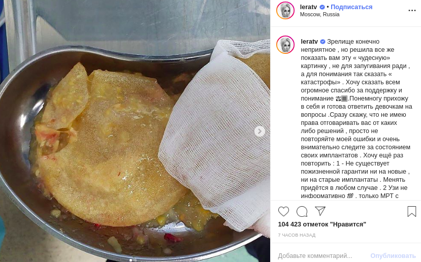 Известная российская телеведущая Лера Кудрявцева выложила на своей странице в сети Instagram фотографию своего грудного импланта, который разорвался.