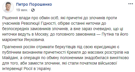 "Решение властей об обмене лиц, причастных к преступлениям против участников Революции Достоинства, оборвет последние ниточки к непосредственных заказчиков преступлений, а уже сейчас очевидно, что эти ниточки ведут в Москву, к главному заказчику - Путина и его марионетки Януковича", - написал Порошенко.