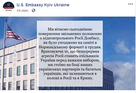 В посольства США отреагировали на обмен удерживаемыми лицами между официальным Киевом и контролирующими отдельные районы Донецкой и Луганской областей т.н. "ДНР" и "ЛНР". Об этом сообщается на странице посольства в Facebook.