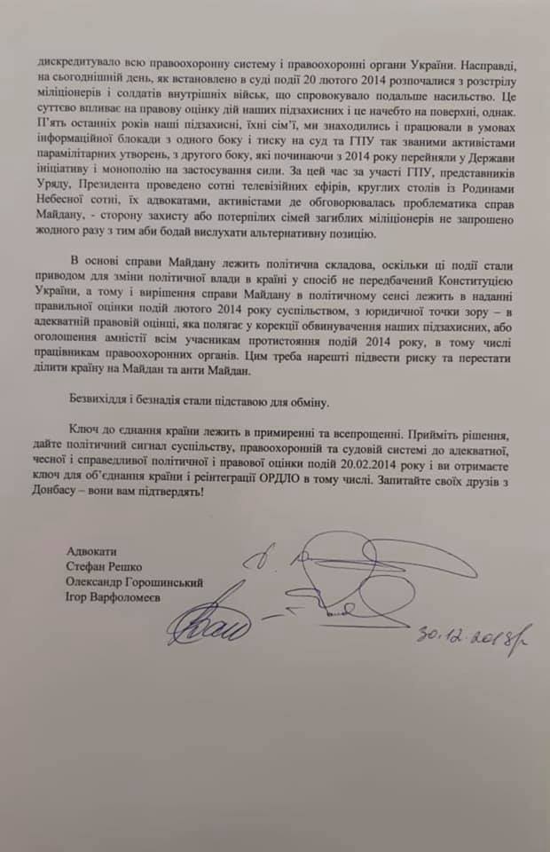 Этим обращением мы хотим, чтобы хотя бы Вы, шестой Президент Украины, гарант Конституции наконец услышали Нас и мы хотим донести свою позицию публично. Для наших подзащитных это решение было не менее сложным чем для Вас. Ключевым обстоятельством, которое обусловило его принятие была не попытка уйти от ответственности, а невозможность добиться справедливой оценки действий наших подзащитных со стороны ГПУ и суда. Сам факт включения их в списки на обмен подтверждает то, что дело политическое. Это так.