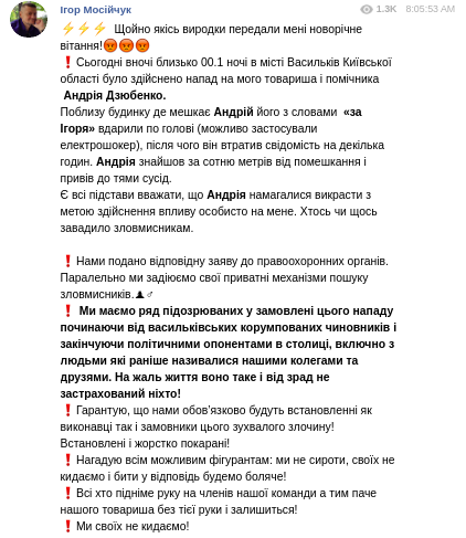Бывший народный депутат Украины Игорь Мосийчук заявил около часа ночь с 30 на 31 декабря в городе Васильков Киевской области было совершено нападение на его помощника Андрея Дзюбенко. Об этом политик рассказал в своем Telegram-канале.