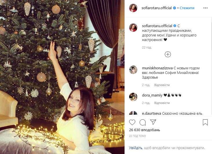 Знаменитая украинская певица София Ротару, которую недавно российский музыкальный критик Сергей Соседов назвал немощной из-за возраста, легла под елку. Фото появилось в Instagram певицы.