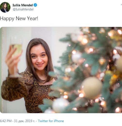 Пресс-секретарь президента Владимира Зеленского Юлия Мендель ограничилась в Twitter кратким поздравлением на английском с новым годом и фото на фоне елочки с бокалом шампанского.
