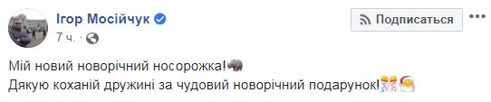 А вот экс-нардеп от Радикальной партии Игорь Мосийчук похвастался в Facebook новогодним подарком. Он сообщил, что любимая жена подарила ему "нового новогоднего носорожку". Напомним, что на прошлый новый год Мосийчуку подарил маленького носорога лидер радикалов Олег Ляшко.
