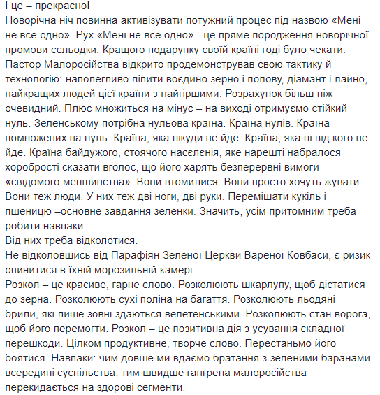 "Я более чем доволен новогодней речью 42-летнего организма, который открыто назвал сам себя врагом украинства. Оно появилось во всей своей красе. Игра окончена. Маски сожжены", - написал скандальный телеведущий.