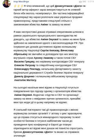 "Убийство Амины Окуевой и покушение на меня были осуществлены по заказу одного из высокопоставленных чиновников РФ.... На сегодня насколько мне известно в Нацполиции готовится сообщение о подозрении одному из организаторов убийства Амины Окуевой. В то же время следствие в СБУ по организации покушения на меня по неизвестным причинам остановилось, по крайней мере мне ни о каких действиях в этом направлении не известно" - сообщил экс-нардеп.
