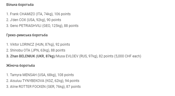 Вместо 10 тысяч франков за третье место Беленюк получит награду в размере 5 000 швейцарских франков, потому как поделил его с россиянином Мусой Евлоевым.