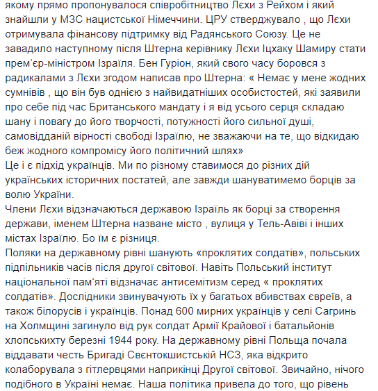 По словам Княжицкого, в этом и есть украинский подход. "Мы по-разному относимся к различным воздействиям украинских исторических фигур, но всегда будем уважаем борцов за свободу Украины. Члены Лехы отмечаются государством Израиль как борцы за создание государства, именем Штерна назван город, улица в Тель-Авиве и других городах Израиля. Потому что для них есть разница. Поляки на государственном уровне чтят "проклятых солдат", польских подпольщиков времен после второй мировой. Даже Польский институт национальной памяти отмечает антисемитизм среди "проклятых солдат". Исследователи обвиняют их во многих убийствах евреев, а также белорусов и украинцев. Более 600 мирных украинцев в селе Сагринь на Холмщине погибли от рук солдат Армии Крайовой и батальонов хлопских в марте 1944 года. На государственном уровне Польша начала отдавать честь Бригаде Свентокшиской НСО, которая открыто колоборационировала с гитлеровцамы в конце Второй мировой. Конечно, ничего подобного в Украине нет. Наша политика привела к тому, что уровень антисемитизма в Украине значительно ниже, чем в той же Польше, а поляков украинцы считают самыми большими приятелями из всех народов.