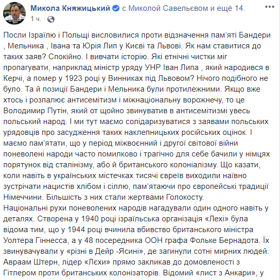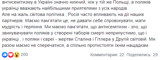 Но к сожалению мировая политика, Россия часто влияют на действия наших партнеров. Мы должны помнить это, не давать себя спровоцировать, иметь мудрость и терпение. Мы должны помнить, что антисемитизм - зло, обвинять поляков в создании лагерей смерти недопустимо, что и украинцы, и поляки и евреи - жертвы Сталина и Гитлера во Второй мировой. Мы вместе должны не спорить, а совместно противостоять их потомкам", - написал Княжицкий.