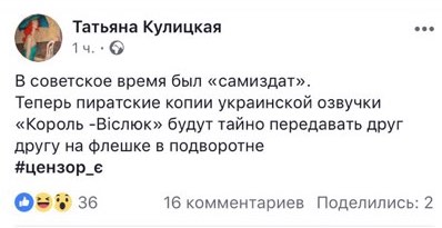 А "теперь пиратские копии украинской озвучки "Короля-осла" будут тайно передавать на флешке в подворотне", –- иронизирует пользователь Facebook Татьяна Кулицкая.
