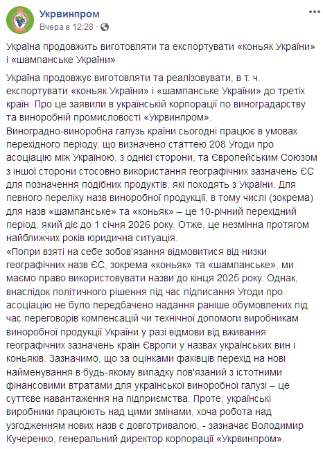Украина продолжит производить и экспортировать "коньяк Украины" и "шампанское Украины" в разные страны до 2026 года, поскольку для внедрения европейский условий и механизмов охраны географических названий предусмотрены 10 лет переходного периода. Об этом сообщает "Укрвинпром" в Facebook.