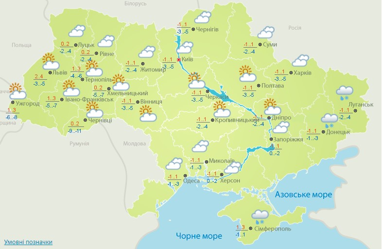 В центральной Украины погода будет солнечная, с небольшой облачностью, температура от +1 до -1 градуса.