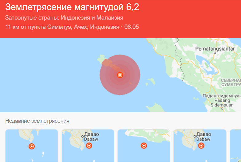 Эпицентр землетрясения располагался в 315 км к юго-западу от города Медан (административного центра провинции Северная Суматра). Очаг залегал на глубине 30 км. Информации о пострадавших пока нет.