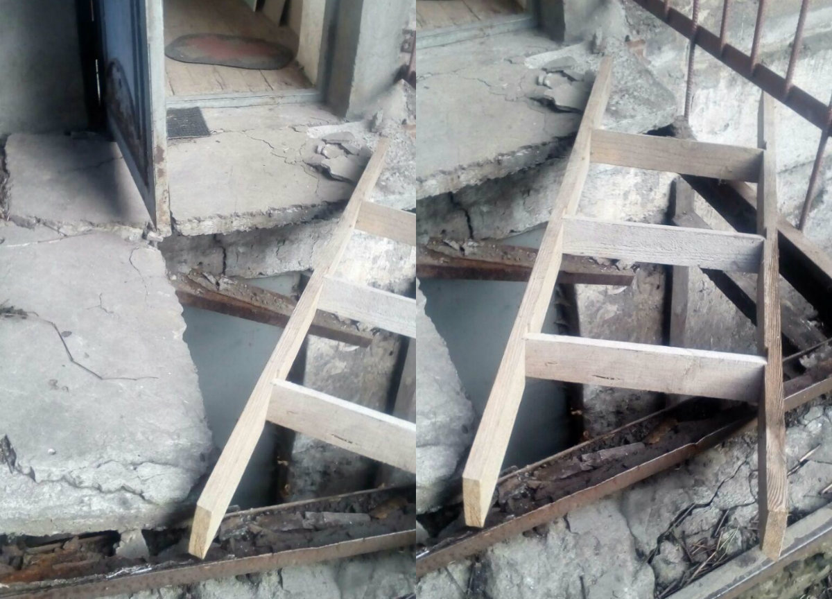 Однако даже после этой ситуации аварийный участок ответственные лица в порядок так и не привели - место, где раньше находилась плита, местные жители закрыли лестницей (чтобы хоть как-то выбираться из подъезда).