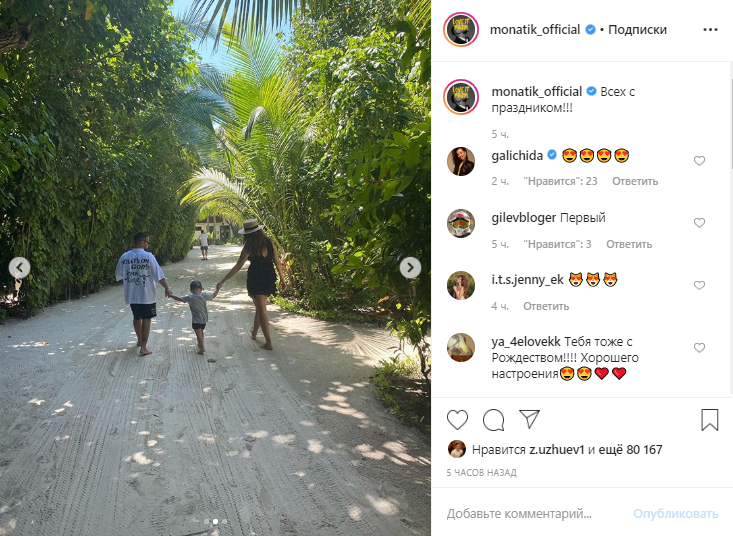 Популярный исполнитель Дима Монатик также поздравил всех с праздниками. Судя по фото, певец празднует Рождество на островах с женой и детьми.