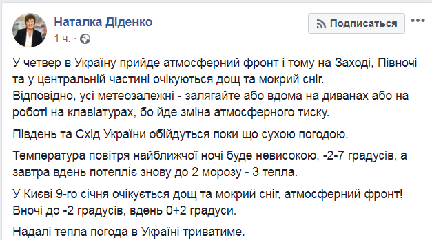 Об этом предупреждает в Facebook синоптик Наталья Диденко.