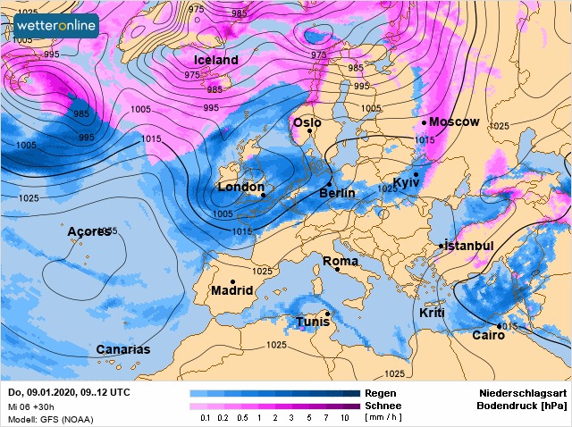 В Киеве 9 января ожидаются дождь и мокрый снег и уже упомянутый атмосферный фронт. Ночью температура упадет до -2, днем будет ​​0...+2 градуса Цельсия.