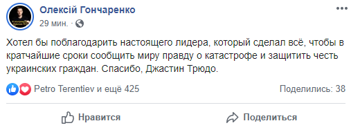 "Хотел бы поблагодарить настоящего лидера, который сделал всё, чтобы в кратчайшие сроки сообщить миру правду о катастрофе и защитить честь украинских граждан. Спасибо, Джастин Трюдо.