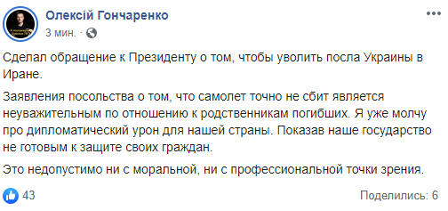 10:25 Нардеп от "Европейской солидарности" Алексей Гончаренко проиронизировал, что главная заслуга в признании Ираном принадлежит канадскому лидеру Джастину Трюдо. Кроме того, он сделал обращение к Президенту о том, чтобы уволить посла Украины в Иране.