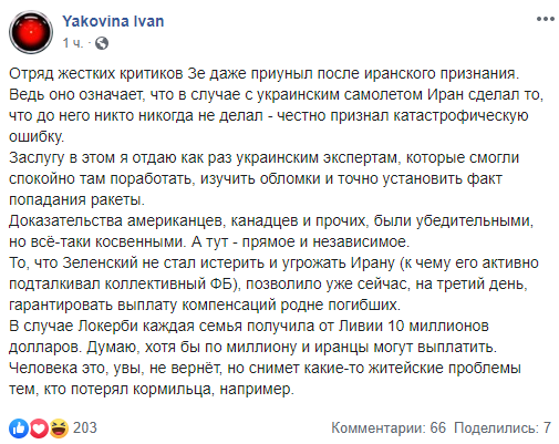 В случае Локерби каждая семья получила от Ливии 10 миллионов долларов. Думаю, хотя бы по миллиону и иранцы могут выплатить. Человека это, увы, не вернёт, но снимет какие-то житейские проблемы тем, кто потерял кормильца, например", - пишет журналист Иван Яковина.
