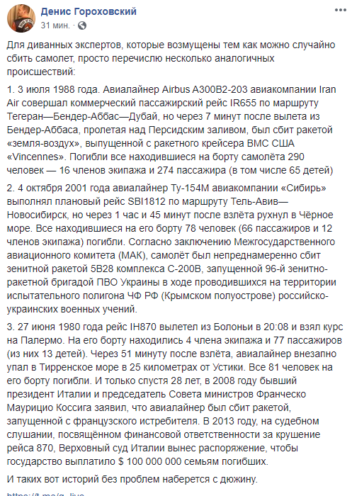 "Для диванных экспертов, которые возмущены тем как можно случайно сбить самолет, просто перечислю несколько аналогичных происшествий: