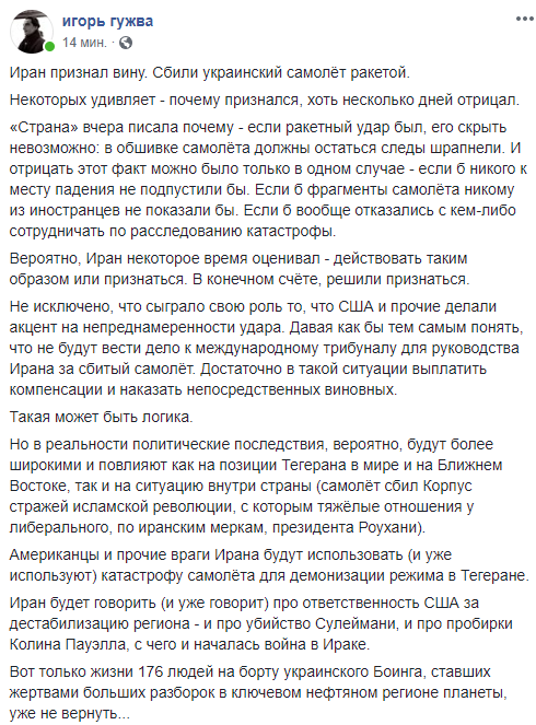 Вот только жизни 176 людей на борту украинского Боинга, ставших жертвами больших разборок в ключевом нефтяном регионе планеты, уже не вернуть..." - пишет Гужва.